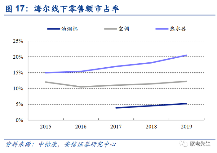 海尔在油烟机、空调、热水器等品类的市占率较低,有望通过平台化、场景化拉动协同销售。空调、厨电为海尔的薄弱品类,且行业竞争格局相对稳定,海尔通过传统的分销模式较难形成突围,在套系化的拉动下可能实现“改道超车”。