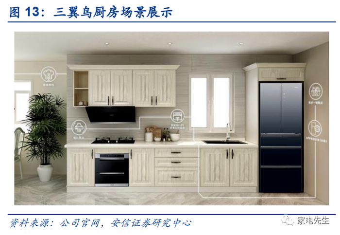 打造场景品牌三翼鸟,为用户提供场景解决方案,加速智家战略落地。2020年9月,公司发布了全球首个场景品牌——三翼鸟。区别于传统的产品品牌,三翼鸟可以为用户提供涵盖阳台、厨房、客厅、浴室、卧室等智慧家庭全场景定制化解决方案。场景品牌打破人、空间、企业之间的传统关系,以用户场景需求为中心,创新提供可体验、可定制、可迭代的智慧生活解决方案,满足消费者全空间、全维度、全流程的场景生活需求,进一步拉动海尔多品类协同销售。