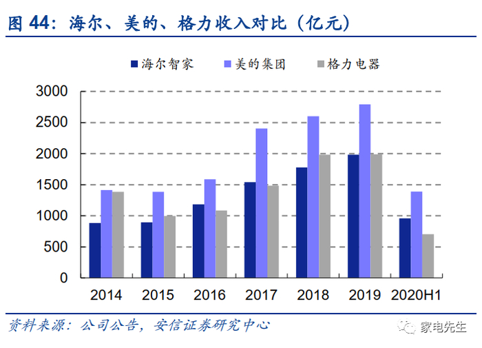 ■场景品牌+高端品牌助力薄弱品类“改道超车”:海尔2019年上线海尔智家体验云平台,推动公司由分销向更注重服务的零售模式转型。通过场景化品牌三翼鸟和高端化品牌卡萨帝的拉动,海尔的厨电、空调等薄弱品类有望实现协同放量,改变在传统分销体系下,难以弯道超车的局面。