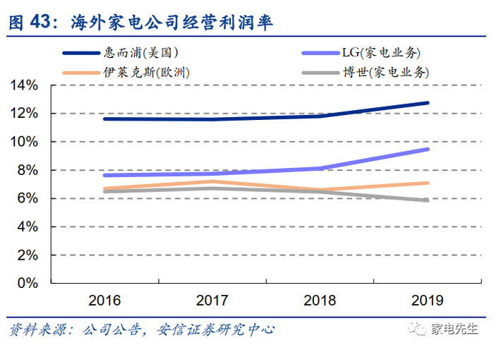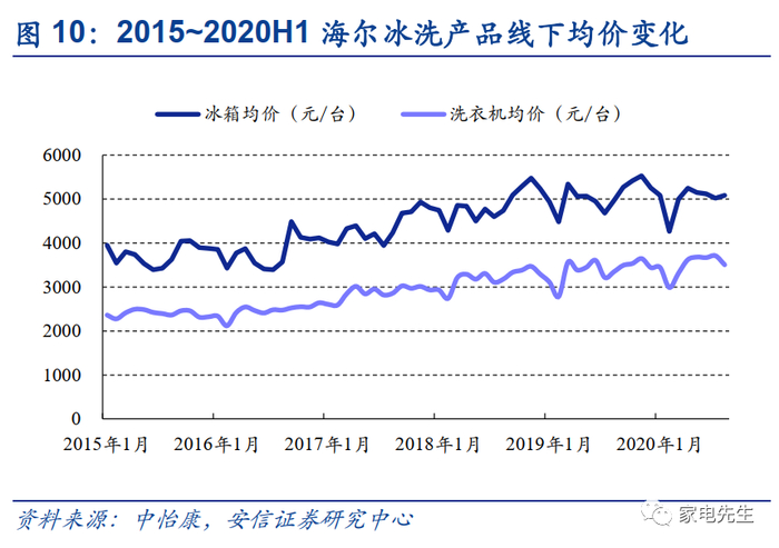 ■冰洗份额持续提升,均价提升拉动盈利能力改善:海尔在冰洗领域市场地位强势,市占率长期处于行业第一。2019年,国外品牌在冰箱、洗衣机市场上零售额占比分别为23.6%、31.9%,海尔仍有进一步挤压国外品牌市场份额的空间。冰洗行业以更新需求为主,行业规模增长主要依靠均价提升。在份额提升和行业均价提升的双重驱动下,海尔冰洗盈利能力有望持续提升。展现龙头应有的优势利润率水平。