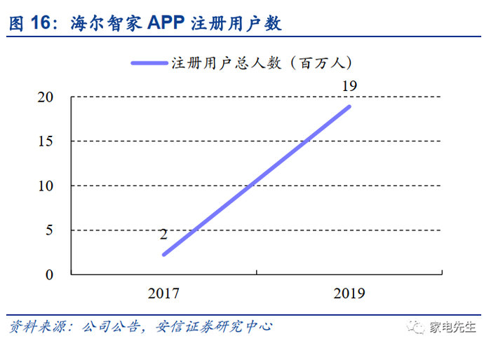 海尔智家打造体验云平台,从卖产品向卖生态转变。海尔积极推进智慧家庭网络布局,开发升级智慧家庭网络触点,2018年海尔建设4个智慧家庭城市体验中心、423个全屋智慧家庭集成店,303个全网智慧家庭体验店(海尔智家2018年报);2019年互联家电激活量YoY+68%。2019年底上线了自主研发的海尔智家体验云平台,实现了用户、经销商及其门店的数字化系统的连接和整合,有望帮助海尔从销售家电产品到销售以互联家电为核心的更丰富的产品和服务。截至2020年6月,海尔智家APP月活跃用户达到429万。