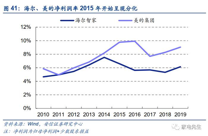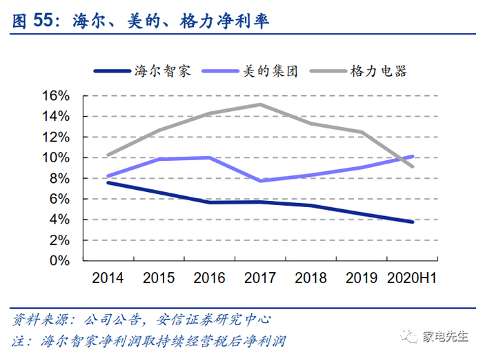 海尔的利润规模与美的、格力存在较大差距,主要原因在于利润率偏低。2019年,海尔净利润仅有123亿元(持续经营净利润90亿元),低于美的的253亿和格力的248亿。利润规模的差距,主要来自利润率的差距。