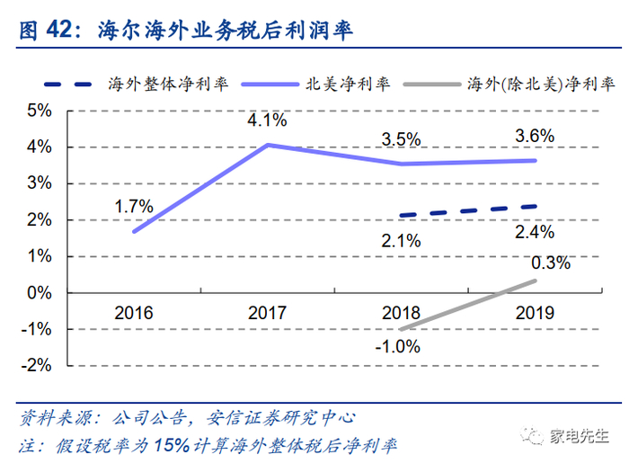 海尔在美国规模逐渐赶超惠而浦,在欧洲规模持续提升。作为一家拥有全球供应链资源以及较好地实现了本地化品牌和渠道布局的公司,叠加中国的人才红利,长期来看,海尔海外利润率不应该低于海外家电公司。海尔经历了大规模的海外并购,现已在海外形成了较为健全的品牌、产品布局。随着海尔在各地区收入规模的不断提升,盈利能力有望持续改善。对标海外家电公司,以欧洲市场为主的伊莱克斯、博世经营利润率中枢约为7.0%;惠而浦在美国的经营利润率中枢约为12.0%。2019年海尔北美地区的税后净利润率为3.6%,海外北美外的其他地区的税后净利润率仅0.3%,虽然税后净利润率的口径与经营利润率有所差异,但是仍然可以看出海尔海外业务的盈利能力处于行业较低水平。我们认为,海尔海外业务利润率水平较低只是阶段性的。海尔在海外打造自主品牌,早期更重视的是收入规模的增长。目前海尔已经通过海尔品牌和海外家电品牌的并购完成了自主品牌的全球覆盖,随着各地区收入规模的不断扩大,海外固定成本将有所摊薄,海外业务盈利能力有望边际改善(2019年海尔海外税前净利率同比+0.3pct)。