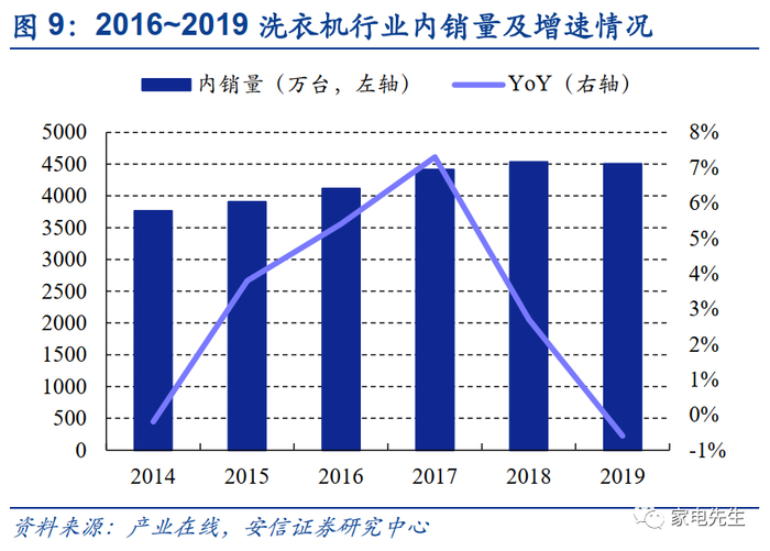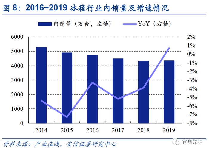 冰洗主要为更新需求,产品升级拉动行业均价提升。冰箱、洗衣机等大家电刚需属性校对较强,相对于空调、厨电等其他家电品类最先普及,普及率较高且近年来保持平稳。根据国家统计局数据,2019年我国冰箱每百户保有量城镇、农村分别为102.5台、98.6台,洗衣机每百户保有量城镇、农村分别为99.2台、91.6台。行业发展成熟,保有量基本饱和,行业需求增速放缓,行业进入存量竞争时代,规模增长将主要靠结构性均价提升带动。