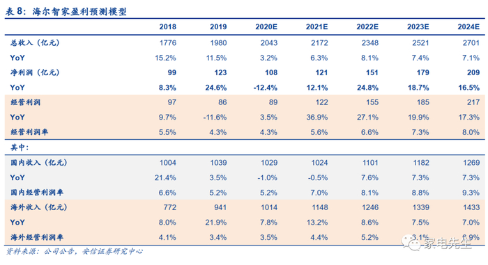 我们对海尔智家2020~2024年盈利预测做出如下假设: