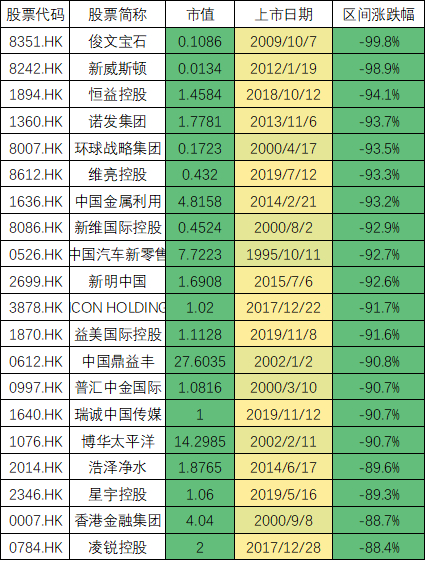 据wind数据,目前港股共计2552只股票,今年有145只新股上市,今年既有五菱汽车这样的10倍妖股,同样也有俊文宝石、诺发集团、濠江机电等动辄暴跌90%的闪崩股。