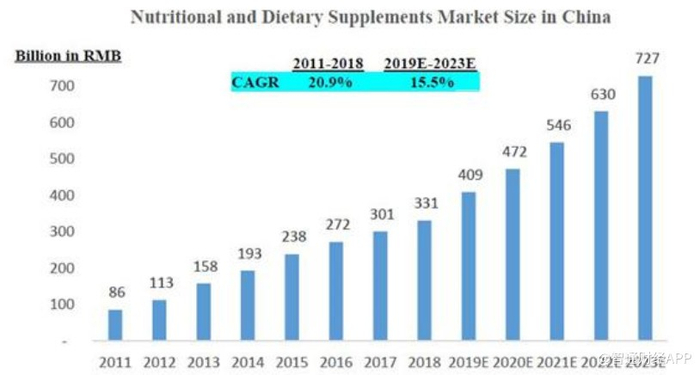 其实,天美生物的发展亦受益于行业成长。据前瞻产业研究院数据显示,2011至2018年,中国的营养和膳食补充剂行业的年复合增速为20.9%;自2019至2023年时,预计该行业的复合增速约为15.5%,仍维持两位数的快速增长,至2023年时,市场规模有望升至7270亿人民币。