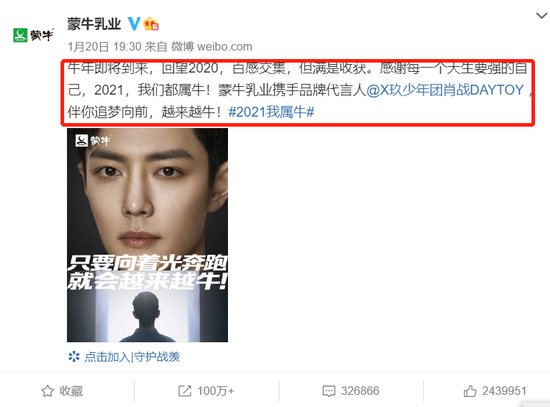 1月20日晚间官宣聘请肖战为品牌代言人,“牛年即将到来,回望2020,百感交集,但满是收获。感谢每一个天生要强的自己,2021,我们都属牛。”
