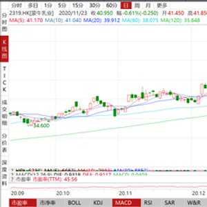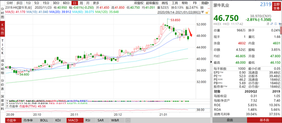 蒙牛乳业连续两日走跌,今日再度跌近3%,两日市值蒸发逾100亿港元。