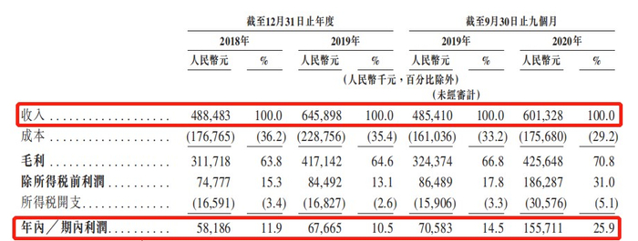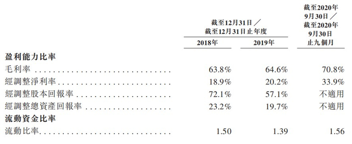 而比起快速的增长速度,令人瞩目的恐怕是它的毛利率水平。据招股书显示,2018年至2019年,该公司的毛利率分别为63.8%、64.6%,逐年提升;而经调整净利率期内则为18.9%、20.2%,亦不断提升。截至2020年前三季度,该公司录得毛利率为70.8%,录得净利率为33.9%,吸金能力可见一斑。