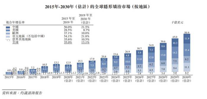 市场容量上,灼识咨询报告显示,中国作为全球第二大市场的整体隐形矫治市场,零售销售收入预期将由2019年的14亿美元增至2030年的119亿美元,复合年增长率达21.5%。同时,随着越来越多的传统正畸案例可通过隐形矫治器治疗,国内正畸市场的发展潜力也不断跃升,预期国内正畸市场按零售销售收入计于2030年将达到296亿美元,2019年至2030年的复合年增长率为13.6%。
