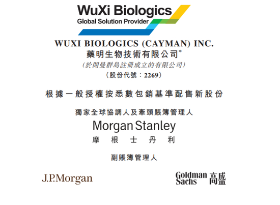 药明生物折让7%配售1.18亿股 筹资132亿港元