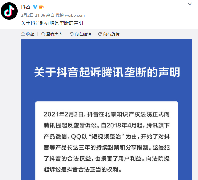 就在过年的关键节口,新闻淡季,头条系下属抖音加了一个猛料,发起反垄断起诉,对手是腾讯。