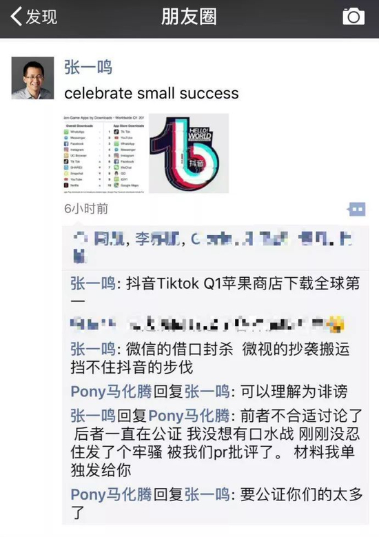 2018年4月起,用户分享抖音链接到微信和QQ平台后均无法正常播放。2018年5月,张一鸣在微信朋友圈评论区感慨:“微信的借口封杀,微视的抄袭搬运,挡不住抖音的步伐。”