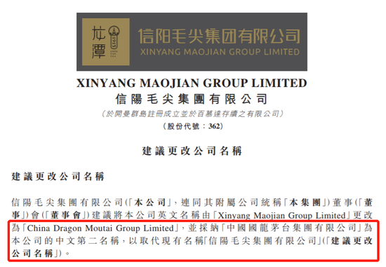 2018年7月13日,中国天化工集团有限公司(00362.HK)召开新闻发布会,宣布更名为“信阳毛尖集团有限公司”。算上本次改名,港股上市公司信阳毛尖已经改名四次,2001年到2002年12月公司名为东君化工,和公司业务契合。2002年12月12日,公司正式更名为大庆石化;2007年8月公司改名中国天化工;2018年11月,公司更名信阳毛尖;时隔2年多公司再度改名中国国龙茅台集团。