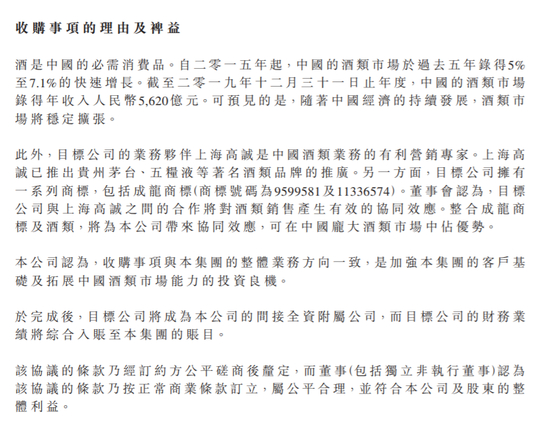 对于收购事项,港股上市公司信阳毛尖表示,随着中国经济的发展,酒类市场将稳定扩张。目标公司的业务伙伴上海高诚是酒类业务的有利营销专家,上海高诚已经推出贵州茅台、五粮液等著名酒类品牌的推广。另一方面,目标公司拥有一些列商标,包括成龙商标等。董事会认为,目标公司与上海高诚之间的合作将对酒类销售产生有效的协同效应。整合成龙商标及酒类,将为本公司带来协同效应,可在中国龙大酒类市场汇总占优势。最后,公司表示,收购事项与集团整体业务方向一致,是加强集团客户基础及拓展中国酒类市场能力的投资良机。(文/金石)
