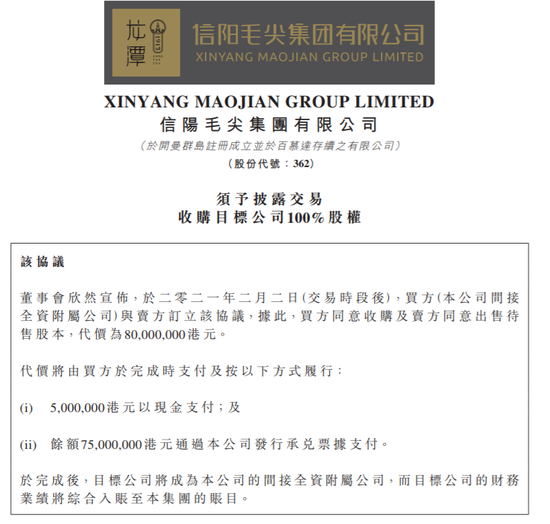 不过,信阳毛尖收购的目标公司处于严重亏损状态,资产净值只有1.5万港元,亏损6.9万,但收购代价高达8000万港元。是蹭热点还是另有所图?