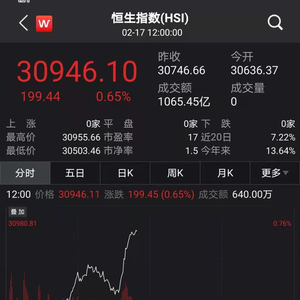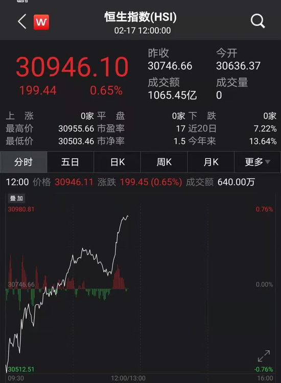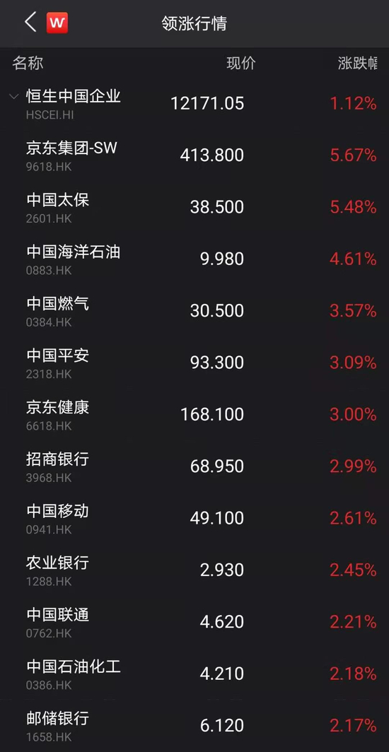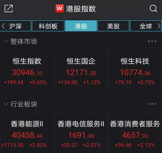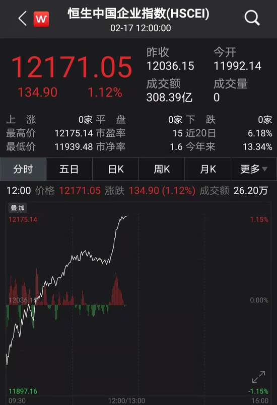 临近午盘,恒生国企指数突然发力,能源、银行、保险等大蓝筹直线拉升,截至发稿,恒生中国企业指数上涨1.12%;恒指上涨0.65%,盘中拉升450点;恒生科技指数上涨0.75%。