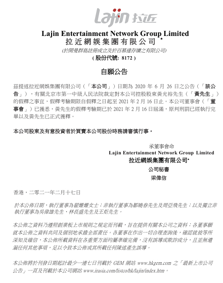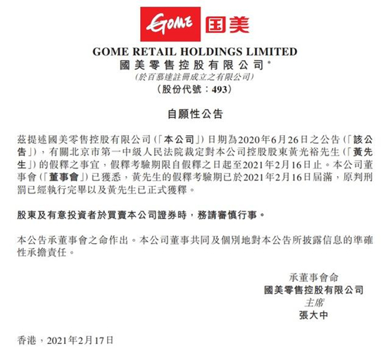 2月17日早间,国美零售、拉近网娱双双于港交所发布公告称,公司董事会已获悉,黄光裕的假释考验期已于 2021 年 2 月 16 日届满,原判刑罚已经执行完毕以及黄先生已正式获释。