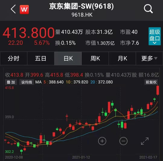 昨日晚间,京东物流正式递交招股书,17日早盘,京东集团一路高歌猛进,站上400港元,总市值接近1.3万亿。