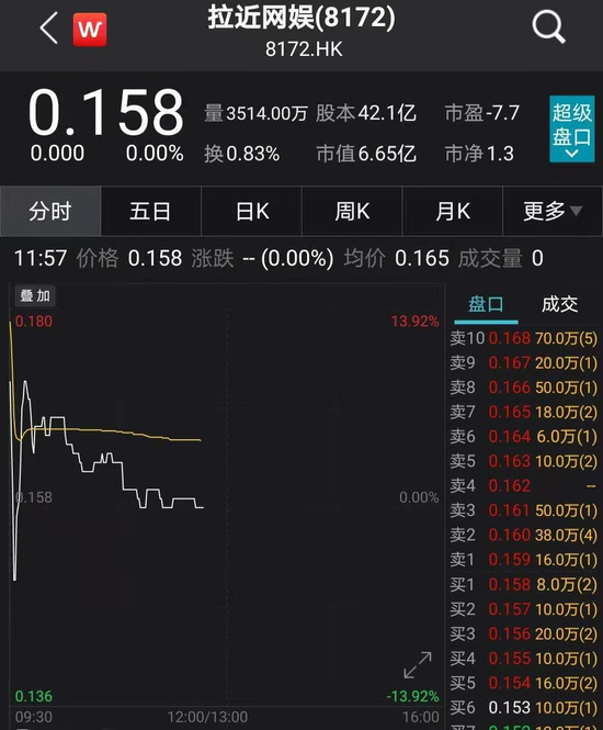 此外,国美系的拉近网娱16日大涨58%。但今天早盘跳涨近14%后,一度跳水翻绿。截至发稿,拉近网娱回吐全部涨幅。