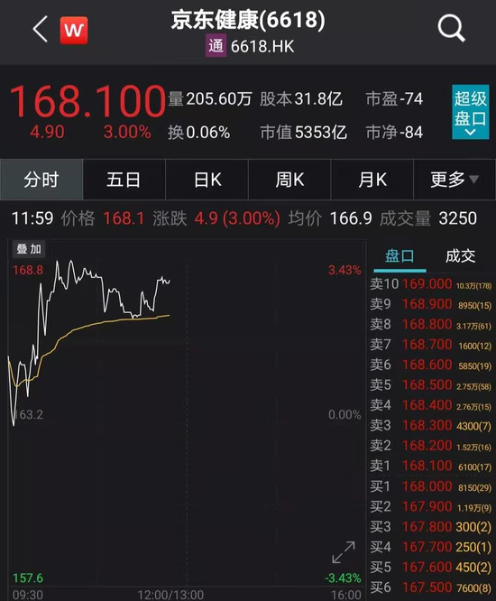 同在香港上市的京东健康也上涨3%,总市值5353亿港元。