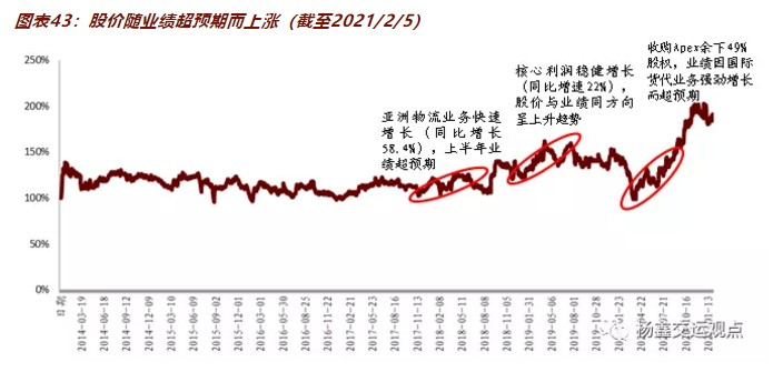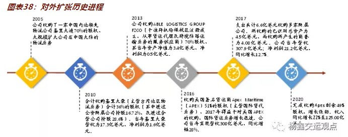2000年后,公司走出中国香港,提升全球物流业务实力。2005年公司收购嘉里大通(从事中国大陆地区物流业务),2010年收购嘉里大荣(主营中国台湾地区物流业务)开拓了公司在中国大陆和中国台湾的物流业务。公司近年来在体内培育了亚洲地区(除大中华地区外)的快递业务,并于2020年将从事泰国快递业务的子公司Kerry Express(KEX)拆分并在泰国上市,成为公司东南亚物流业务进展的一块里程碑。同样在2020年公司收购Apex Group全部股权(从事国际货代业务,是往返亚洲美洲的第二大无船承运商),推动亚洲外物流业务的进一步扩张。