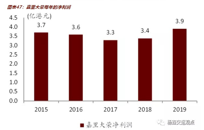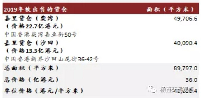 以我们估算2019年香港货仓贡献税后利润约8.8亿港元(包括香港货仓业务分部利润税后4.0亿港元与作为投资性房地产的公允价值变动收益4.8亿港元),母公司的收购市盈率为15倍左右。而参考历史,每平方米4万港元与公司此前2019年3月出售旗下2个香港货仓给母公司时的价格相仿。由图表48计算,本次公司以每平方米约4万港元的价格将拥有的全部7个货仓(楼面面积约38.2万平米,收购总对价135亿港元)出售给嘉里控股全资子公司。