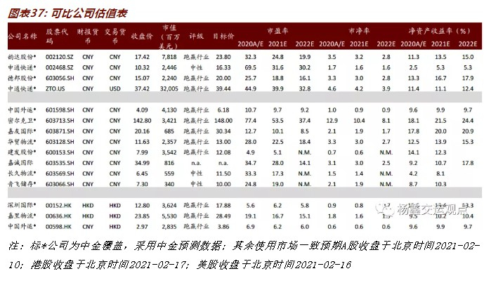 快递和保税仓业务或将推动公司业绩与合理估值继续提升。同样以收购后口径计算,公司现价对应2021/2022/2023年33.4倍/28.4倍/24.4倍核心市盈率。我们认为随着未来公司高增长的快递业务、保税仓业务利润贡献提升(上述两业务的国内可比公司平均交易在33/28倍2021年市盈率),公司未来估值水平或将持续得以提升。