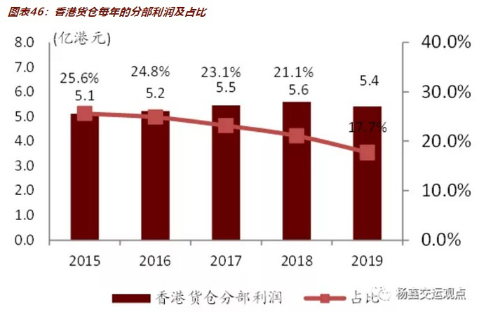 香港货仓业务主要给用户提供短期和长期的租赁服务,利润主要来源于稳定的租金(贡献分部利润稳定在5亿港元左右)。过去五年利润同比增速3%,占分部利润的17.7%。此外香港货仓在报表中作为公司的投资性房地产列示,每年有可观的公允价值变动损益列入非核心盈利中(2013年以来投资性房地产公允价值变动损益在5-10亿港元之间波动)。这一部分也将在顺丰收购同时、剥离出上市公司体外。