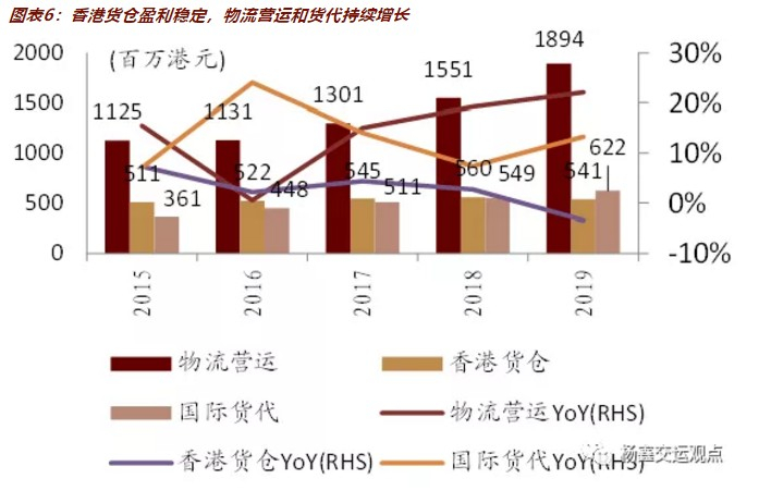 公司主营综合物流和国际货代。公司主营业务可分为:综合物流(IL)业务,包括香港货仓(HKW)与物流营运(LOP);国际货代(IFF)。2019年物流运营、国际货代、香港货仓业务分部利润分别为18.9亿港元(占比62%,2014-2019年复合增速14%)、6.2亿港元(占比20%,2014-2019年复合增速13%)、5.4亿港元(占比18%),1H2020分别占比59%、15%、26%。区域分布上,2019年中国香港、亚洲(剔除大中华)、中国台湾、中国大陆、其他区域(包括美洲、欧洲等)分别占比32%、27%、16%、16%、9%;1H20分别占比35%、26%、17%、14%、8%。
