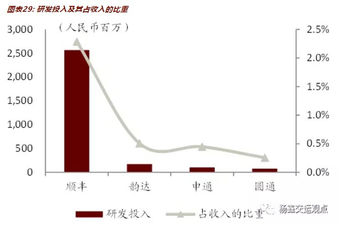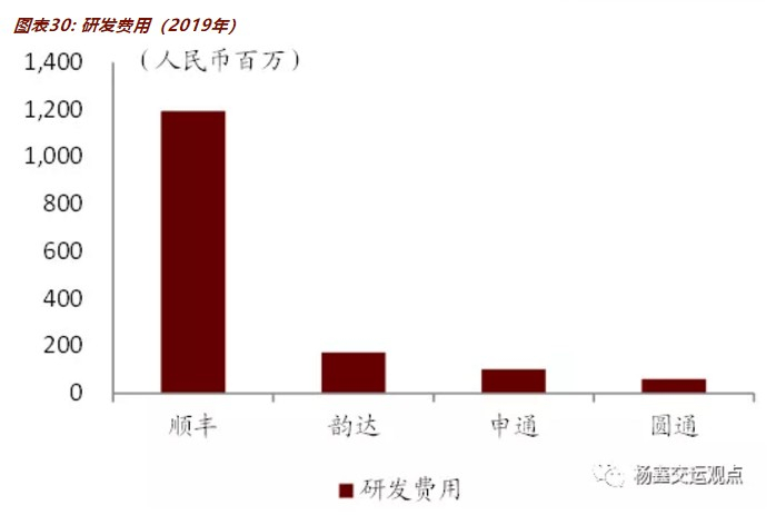 顺丰控股研发投入高,在物流科技领域跑在前端。2019年顺丰的研发人员达到5,058人,人才实力雄厚;科技投入金额达到37亿元,同比增长35%,其中研发支出达到26亿元,同比增长19%,相较于韵达、申通和圆通快递,资金支持力度更大。