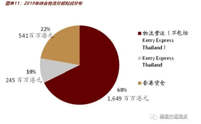 公司最早从提供香港货仓租赁服务开始,后逐渐围绕客户的需求、渗透至仓储外的其他物流环节(如干线运输等),目前也有一部分业务从物流环节向上延伸至生产加工、向下延伸至销售环节。目前公司的综合物流以发展To B物流(香港货仓+合同物流)为主,约贡献2019年综合物流分部利润的90%(对应22亿港元),而泰国快递约贡献10%的分部利润(其他地区的快递业务规模相对小且有赢有亏、我们暂不考虑他们的盈利)。
