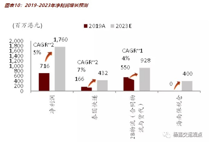 在以上假设下,我们预计2023年净利润将达到17.6亿港元(可比口径下2019-2023年复合增速25%),其中To B物流(合同物流和货代)贡献9.28亿港元净利润(占比53%),泰国快递贡献4.32亿港元(占比25%)、海南保税仓贡献4亿港元(占比23%)。(图表9)