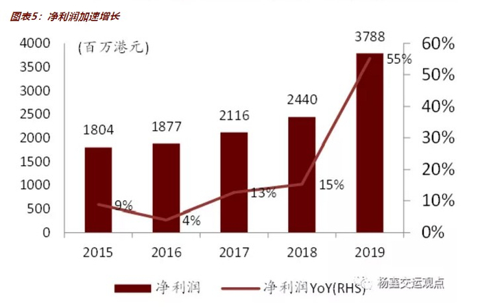 公司从事综合物流与国际货代业务,2019年物流运营/香港货仓/国际货代分别贡献利润的62%/18%/20%。公司继承国际化基因,全球铺设物流网络、积累B端头部客户,2019年发展为物流行业营收亚洲第九,海运货代全球第六。公司过去五年营收/净利润复合增速14%/18%,2019年净利润38亿港元(剔除货仓出售一次性影响净利润19亿港元)。