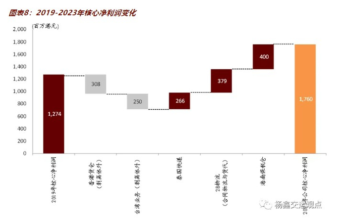 公司将缺少香港货仓与台湾业务贡献的利润(2019年我们估计两者合计贡献公司净利润5.6亿港元,其中香港货仓贡献3.1亿港元、台湾业务贡献2.5亿港元),同时由于香港货仓以作为投资性房地产贡献的公允价值变动收益也不再有(2018年贡献非核心利润4.8亿港元,香港货仓贡献了大部分投资性房地产公允价值收益,我们保守假设该科目为零,则未来公司核心净利润约等于净利润值);