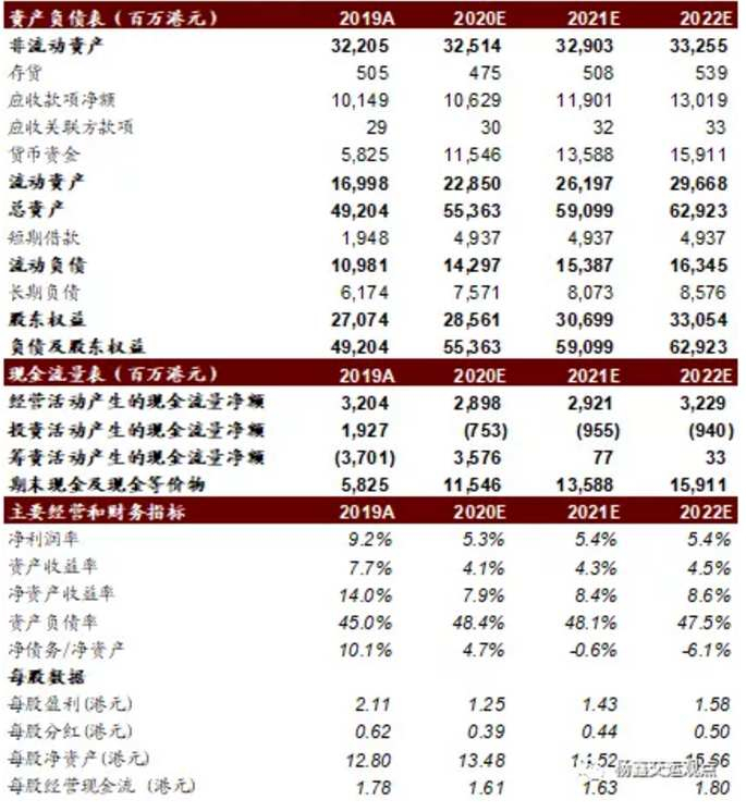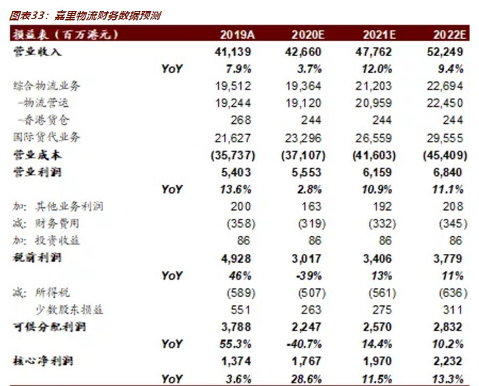 受益于疫情期间中国行业整体恢复速度快,且出口持续维持较高景气,我们预期公司2020年业务整体发展平稳,2020-2022年公司营收同比+4%/+12%/+9%,净利润同比-41%(2019年香港货仓处置收益高基数)/+14%/+10%,核心净利润同比+29%/+12%/+13%,分业务来看,具体如下: