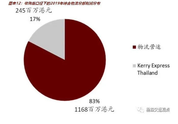 而未来顺丰完成收购后,嘉里物流将香港货仓与台湾业务出售给母公司、剥离至上市公司体外。现有业务保留剔除台湾地区的物流运营业务和货代业务,快递在综合物流业务分部利润中的比重上升至17%,而2B物流仅保留除台湾地区外的合同物流,贡献分部利润占比至83%(对应11.7亿港元)。(图表12)