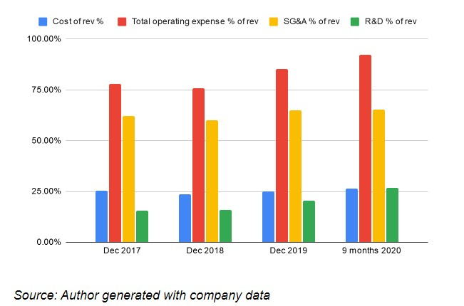 下面的柱状图显示了以收入百分比衡量的运营成本和费用。请注意,自2017年以来,Airbnb的收入成本一直稳定在25%,因此它似乎很好地处理了持续实现75%的毛利率。