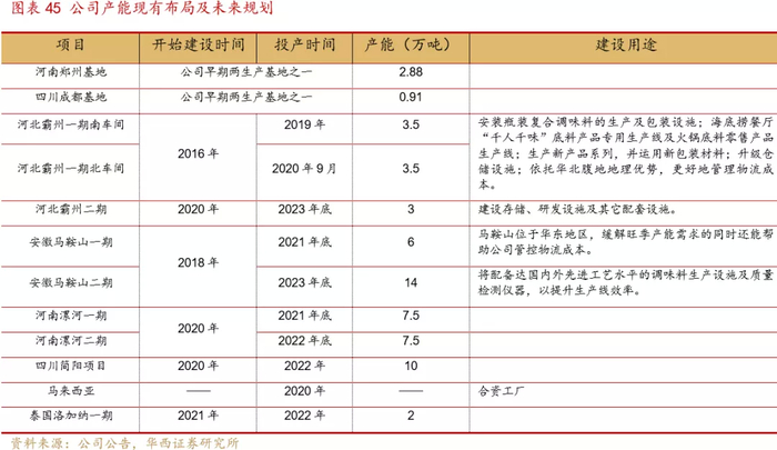 产能快速投产,国内外齐布局。公司新建产能中河北霸州一期南北车间均已投产,带来7万吨产能,并为海底捞“千人千味”底料提供了专用生产线,同时凭借华北腹地地理优势降低了物流成本;马鞍山基地、漯河基地、简阳基地和霸州二期也将在2023年之前陆续投产。