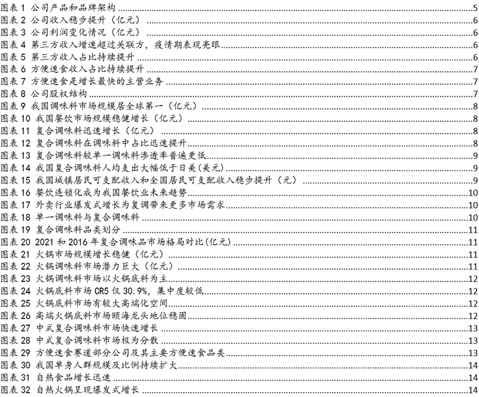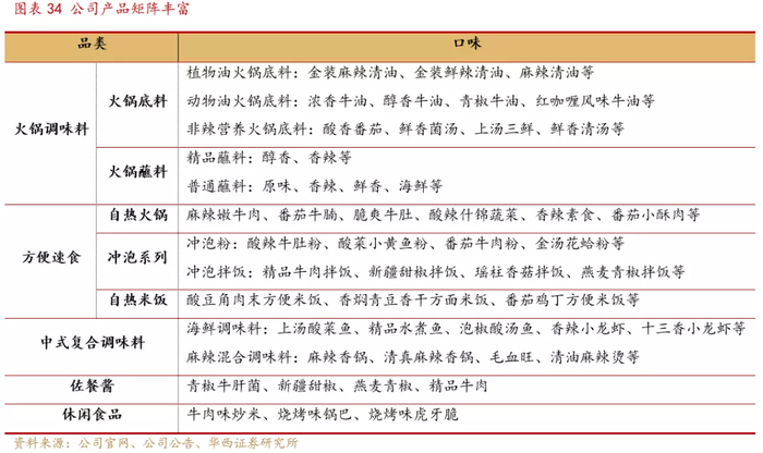 公司2016年上市,整体规模已超50亿元,是国内高端火锅底料的领导者,也是复合调味料产品的知名品牌,近两年推出的自热火锅、自热米饭丰富了产品矩阵,将品牌优势延伸至方便速食领域。