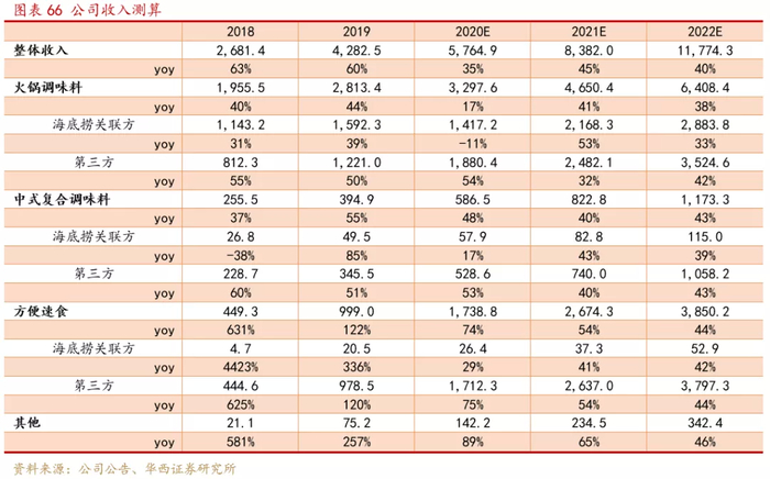 公司是国内领先的复合调味品制造商,正值快速成长期。我们认为随着公司产能陆续达产、海底捞火锅产品持续增长、渠道和品类扩张带动第三方业务快速成长,预计未来三年公司收入将分别同比增长35%/45%/40%,到2022年收入规模将超过百亿元。