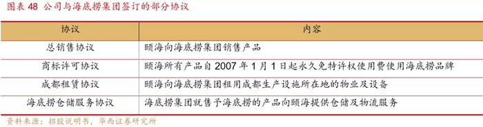 公司还与海底捞签署了多项深度合作协议,其中商标许可协议允许颐海自2007年1月1日起永久免特许权使用,在所有产品使用海底捞品牌,由此公司向第三方销售的产品在市场营销、品牌塑造等方面获得了海底捞品牌的认知度、美誉度优势,对其他竞品品牌建立竞争优势。