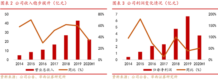 势头强劲,收入利润高速增长。公司营业收入稳步提升,2014-2019年5年时间营业总收入由5亿元增长至42.9亿元,年复合增长率达53.5%;净利润也由2014年的0.44亿元增长至2019年的6.65亿元,年复合增长率达72.1%。