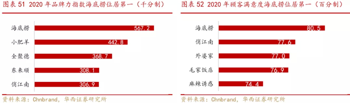 在规模扩张的同时,海底捞通过极致热情的服务打造差异化的品牌形象,同时积极通过社交媒体、冠名赞助等途径进行营销,如2011年一度在微博走红的“海底捞体”、2016年海底捞冠名赞助的中国火锅出品大赛等。近年来海底捞已成为我国第一火锅品牌,在权威品牌评级机构Chnbrand发布的中国品牌力指数榜单中,海底捞已连续三年位居中式连锁餐饮品牌之首,在顾客满意度榜单和顾客推荐度榜单中海底捞也位居榜首。海底捞的品牌影响力不仅仅体现在火锅业态中,在火锅底料产品中海底捞也是高端火锅料产品的代表,消费者品牌认知度高。