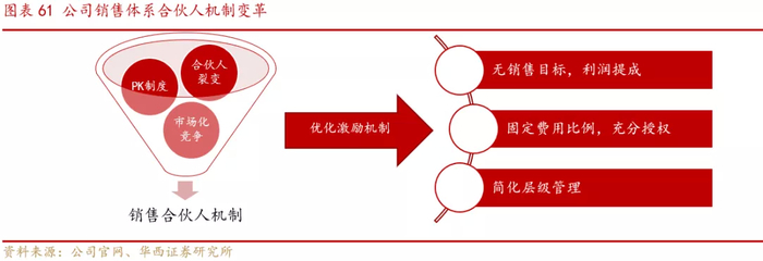 对内强化销售体系建设:持续深化裂变,提升队伍效率 公司在销售人员体系建设中打造了独特的合伙人机制,并在此基础上不断细化激励机制,引入“师徒制”,提升销售团队竞争力。 引入合伙人制,激发销售人员积极性。