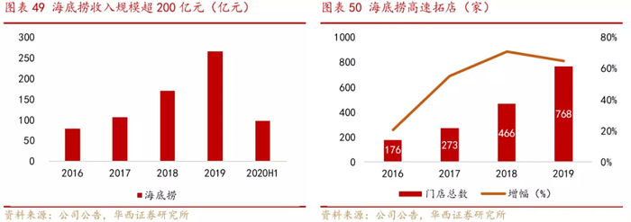 海底捞是火锅餐饮龙头,品牌认知度美誉度极高。海底捞是火锅行业龙头,营业收入领先业内竞争对手,2019年营业收入265.6亿元。海底捞还保持着门店数量的高速扩张,截至2019年末,海底捞总门店数达到768家,年度净开店数303家,尽管在2020年疫情期间收入遭到重创,但海底捞拓店步伐并未停止,截至2020年6月30日门店数已达935家,下半年以来,开店速度仍在加快。