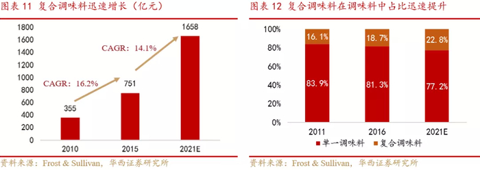 根据Frost & Sullivan的数据,复合调味料在调味料中占比从2011年的16.1%提升至2016年的18.7%,预计2021年该数值将进一步提升至22.8%。