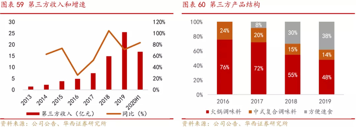 公司起源和根植于海底捞,既是海底捞火锅底料产品的最大供应商,又拥有海底捞品牌的永久使用权。公司近几年加快发展步伐,不仅局限于海底捞关联方供应和火锅底料类产品生产销售,渠道端积极拓展第三方渠道,2019年第三方渠道收入占比达到61%,2020H1更是高达72%;产品端加快复合调味料、方便速食的研发生产,丰富产品组合,形成三大品类齐头并进的成长趋势。
