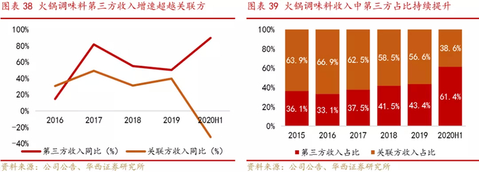 火锅调味料仍是第一大主营业务,方便速食为新增长点。公司的三大主营业务中火锅调味料始终是第一大收入来源,主要来自与海底捞的关联方收入;但近年来随着第三方渠道收入持续发力,与关联方收入的差距持续缩小,2017年后火锅调味料第三方收入增速超越关联方,2015年至2019年第三方收入年复合增长率达48.4%,2020年上半年因关联方收入受疫情影响大幅下滑,第三方收入一度实现反超。